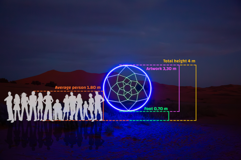 De vorm van het kunstwerk vertelt hetzelfde verhaal. De cirkel symboliseert de oneindige kringloop van het leven. Binnen de ring verstrengelen gedachten en dromen zich in sierlijke vormen, terwijl in het hart een heldere ster gloeit – één van de ontelbare lichten die boven ons waken.